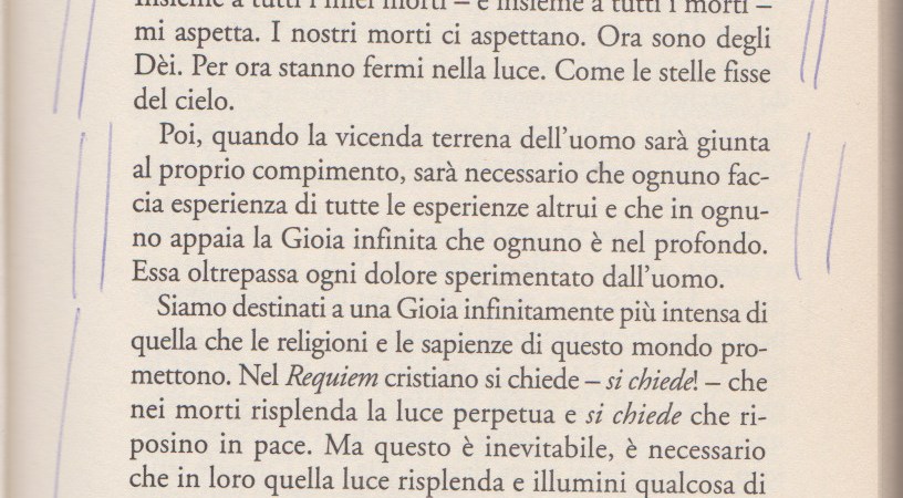 … Poi, quando la vicenda terrena dell’uomo sarà giunta al proprio compimento, sarà necessario che ognuno faccia esperienza di tutte le esperienze altrui e che in ognuno appaia la Gioia infinita che ognuno è nel profondo. Essa oltrepassa ogni dolore sperimentato dall’uomo …