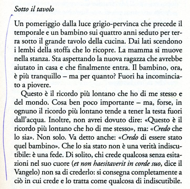 “E’ quindi inevitabile che, da che nasce, l’uomo avverta come prioritario l’andare alla ricerca di un Rimedio, di un Riparo che gli consenta di sopportare o addirittura di vincere l’angoscia, la sofferenza, la morte. Nascere è avvertirle da subito, sia pur confusamente. Lo scopo essenziale, fondamentale di ogni forma di civiltà e di cultura è il continuo potenziamento del Riparo. Ogni gesto, azione, pensiero, affetto della vita quotidiana è sin dalla nascita un’espressione della volontà di essere al Riparo, cioè della volontà di potenza e di salvezza. Anche un bambino che un pomeriggio dalla luce grigio-previnca che precede il temporale sta sotto al tavolo grande della cucina ad aspettare un estraneo si sta mettendo a quel Riparo.