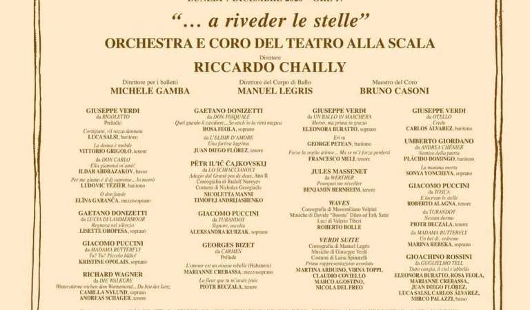Alberto Mattioli su La Stampa: «La prima della Scala covidata più strana di tutti i tempi: niente pubblico in sala, niente opera, ma un concertone lirico per la tivù (quasi tutto registrato). Titolo: A riveder le stelle, insieme un augurio e una constatazione, dato che le stelle del canto ci sono quasi tutte. Unica certezza: sul podio, come sempre, il direttore musicale della Casa, Riccardo Chailly. Rimpianti? “Sinceramente sì. Dovevamo inaugurare con una Lucia di Lammermoor che non abbiamo nemmeno mai potuto annunciare ufficialmente. Avevamo però già fatto due settimane di prove, lo spettacolo iniziava a prendere forma. È un grande dolore, una sofferenza, non vederlo in scena. Era dal ’67, dalla famosa edizione Abbado-De Lullo, che la Scala non apriva con Donizetti. Allora c’ero, sarebbe stato bello riportare Lucia alla prima”. Parliamo di questo 7 dicembre. Il programma è lungo e in gran parte sarà registrato prima. Che effetto le fa? “Intanto bisogna venirne a capo. La gabbia organizzativa è molto complessa, con arrivi e partenze continui di cantanti che raggiungono Milano da tutto il mondo, in un momento in cui viaggiare non è esattamente facile”. […] Però non c’è l’opera, ma una specie di antologia… “L’idea è che non sia soltanto un serie di arie staccate, ma un vero percorso sia dentro i singoli titoli, con più brani di ognuno, sia attraverso un secolo di opera italiana, dal Tell di Rossini a Turandot di Puccini. Più qualche brano non italiano, come Carmen o il finale del primo atto di Walküre di Wagner. Per l’orchestra si tratta chiaramente di un impegno enorme: non solo per la quantità di musica, circa tre ore, ma anche per le differenze stilistiche, che ovviamente non bisogna appiattire. Per chi suona, un viaggio epocale”. La fine è l’inizio: il programma si chiude con l’apoteosi finale del Tell. “L’ho voluto in italiano e non nell’originale francese perché si capiscano le parole di Calisto Bassi sulla musica sublime di Rossini: “Tutto cangia, il ciel s’abbella,/ L’aria è pura, il dì è raggiante”. Un messaggio di speranza che dalla Scala si alzerà verso Milano, l’Italia e il mondo, sperando che questa pandemia non sia soltanto una tragedia ma anche una catarsi purificatrice”. Come sarà fare musica senza pubblico? “Sono sincero: non lo so. Non mi è mai capitato. Ma so che senza il calore del pubblico, senza l’applauso finale, sarà diverso, si avvertirà un vuoto. Stiamo facendo un lavoro che non è il nostro, in condizioni che non sono quelle abituali, in una situazione di emergenza dove tutto è inusuale, a cominciare dal fatto che l’orchestra suona in platea, il coro canta nei palchi e io dirigo guardando verso il palco reale. È un unicum, un’esperienza eccezionale e non ripetibile”».