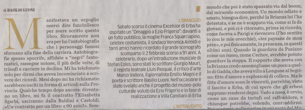 BASILIO LUONI ricorda: EZIO FRIGERIO, “Io sono un mago”, Baldini&Castoldi, 2021. Articolo in La Provincia/Stendhal, 5 marzo 2021