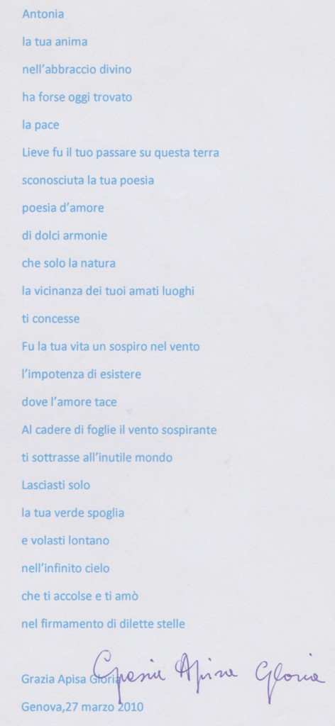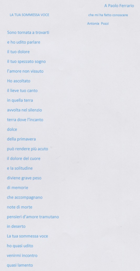 Grazia Apisa Gloria, La tua sommessa voce. Dedicata a Paolo Ferrario, che mi ha fatto conoscere Antonia Pozzi, 27 marzo 2010