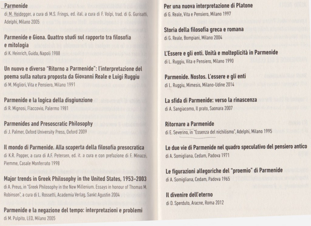 Va comunque precisato che in ambito neoplatonico (Proclo, Simplicio), interessato a una lettura degli Eleati in senso più metafisico, con tale titolo sembra indicarsi soprattutto la seconda parte del poema, concernente argomenti più propriamente legati alla fisica; tale notizia troverebbe conferma anche da come il poema è citato in Plutarco (Erotico, 13, 756 F), Kosmogonìa, discorso cioè essenzialmente sull’origine delle cose, salvo poi estendersi ad indicare tutta l’opera in quanto concernente il kósmos, ossia il mondo inteso “quale un tutto nel suo splendido ordine” (M.Untersteiner, 1967, p.26).