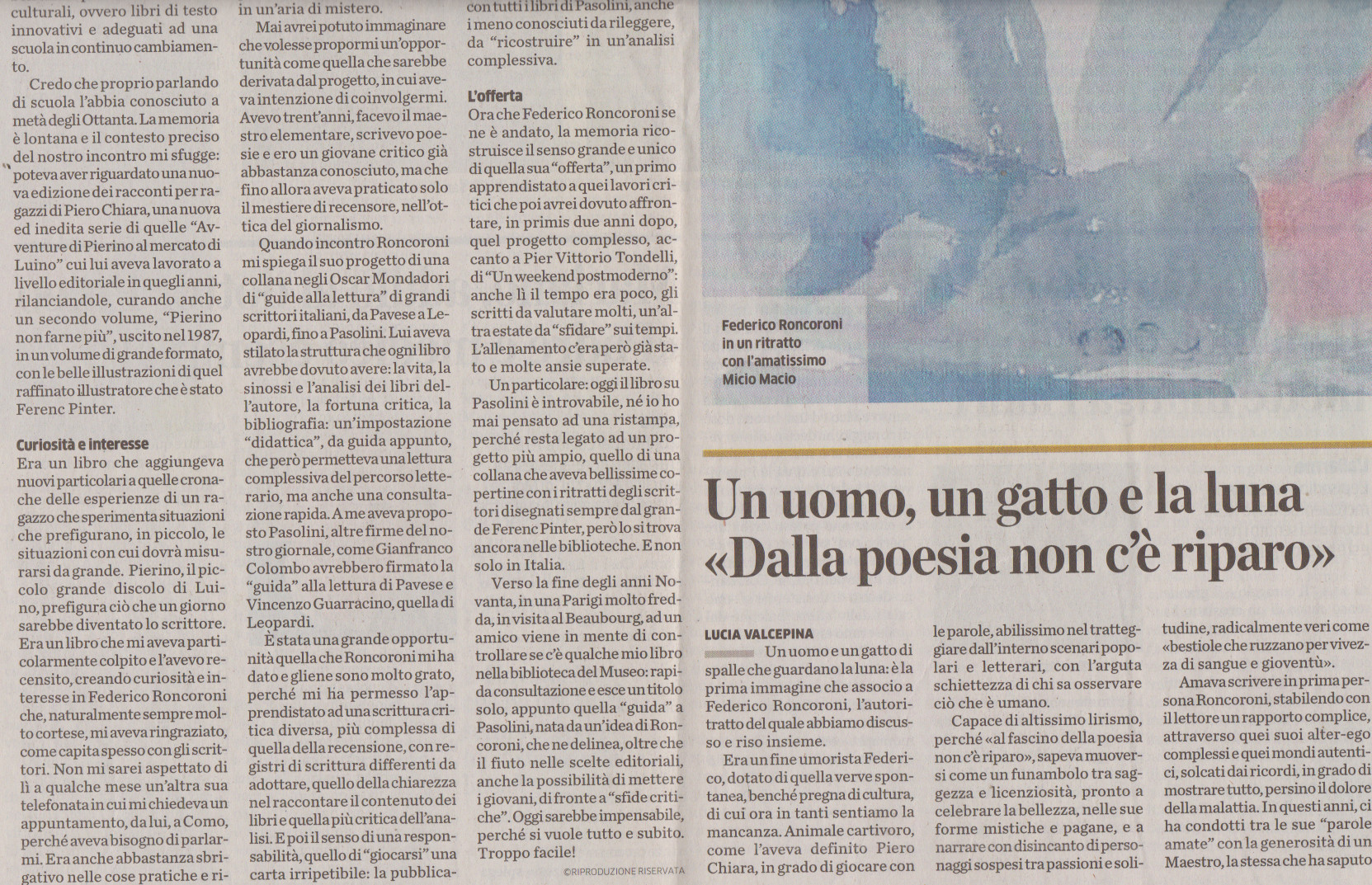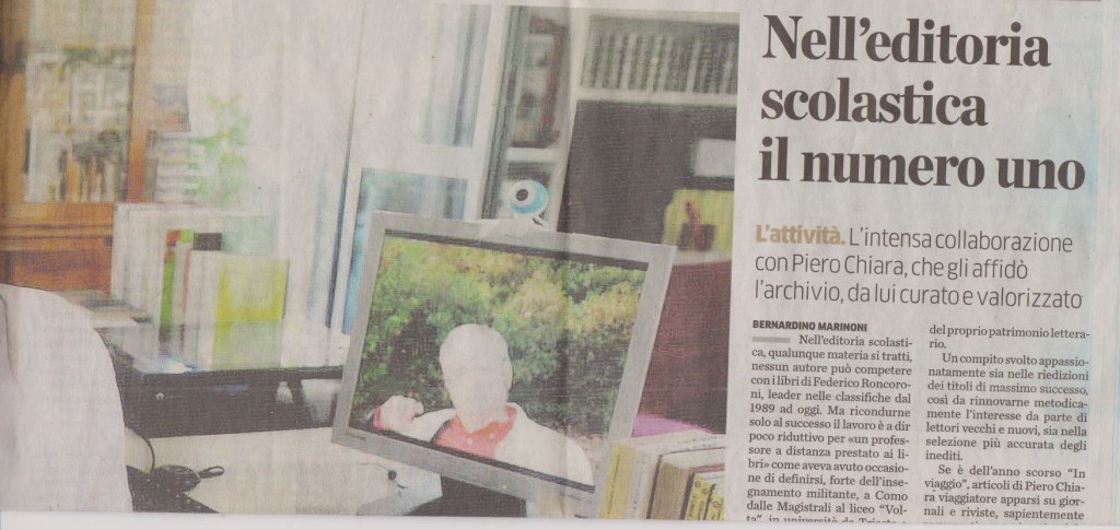 Stretto collaboratore e amico di Piero Chiara, Roncoroni di tanto in tanto concedeva ai suoi lettori qualche rarità, qualche chicca tratta dalle carte private dello scrittore di Luino che lo lasciò erede del suo patrimonio letterario.