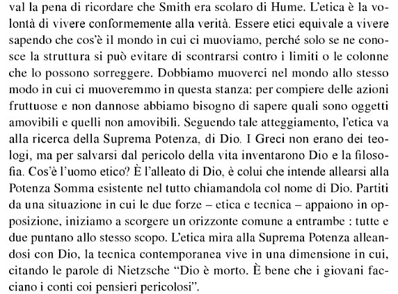 Per trovare stabilità in questa deriva dobbiamo costituirci più che mai come soggetti morali. A tale scopo è necessario ripiegare su di sé: bisogna raccogliere e governare la propria potenza. Divenire “soggetto morale” vuoi dire costituirsi come punto di resistenza a fronte della mobilità e delle perturbazioni dell’ambiente; ergersi a momento stabile di selezione/decisione. Se occorre, farsi luogo di neutralizzazione e di indifferenza: di assenza. Per far questo ci vuole abilità. In effetti questo è il significato originario della parola arete: virtù. Virtuoso è in primo luogo colui che è dotato di agilità, che sa trarsi fuori dalle difficoltà. Divenire legge a se stessi significa volgere la propria potenza in forma, il proprio desiderio in carattere. Questa e non altra era la ragione per cui gli antichi dicevano che ciò che è buono è bello e ciò che è bello è buono.